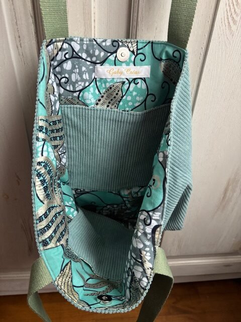 À l’intérieur, deux poches plaquées généreuses (17 cm de largeur et 16 cm de longueur environ) de chaque côté en velours côtelé marron clair (extérieur) et wax (intérieur) rappelant la doublure permettent de ranger clés, téléphone ou petits indispensables.